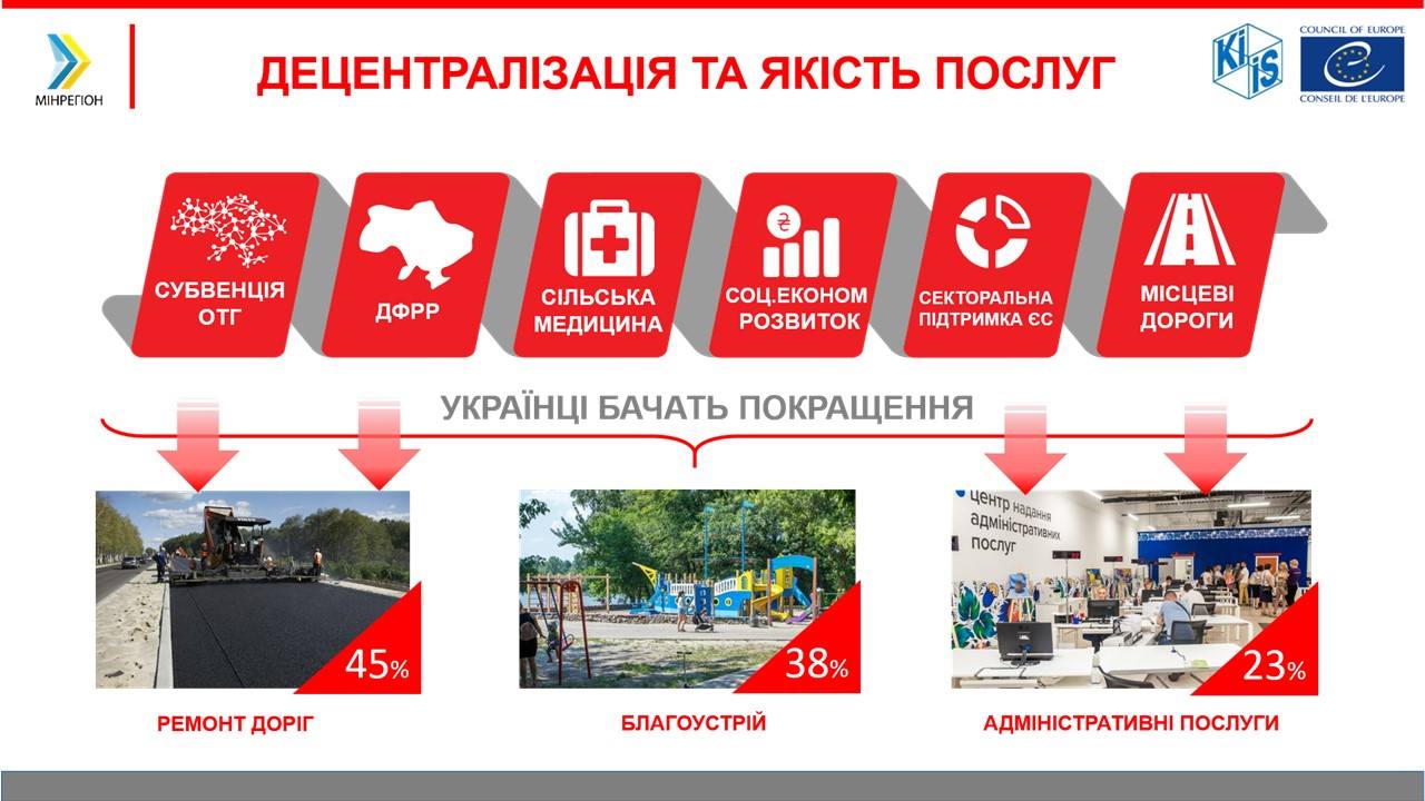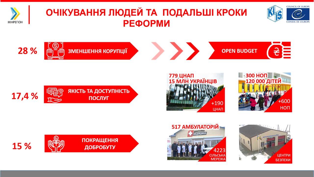 Найбільш очікуваними результатами від реформи є поліпшення якості та доступності послуг: покращення добробуту громад відчули 49% громадян України, а зменшення корупції — 47%. Загалом, 45% українців бачать покращення від реформи децентралізації у сфері ремонту та утримання доріг, 38% – у сфері благоустрою, у випадку надання адміністративних послуг — 23%.