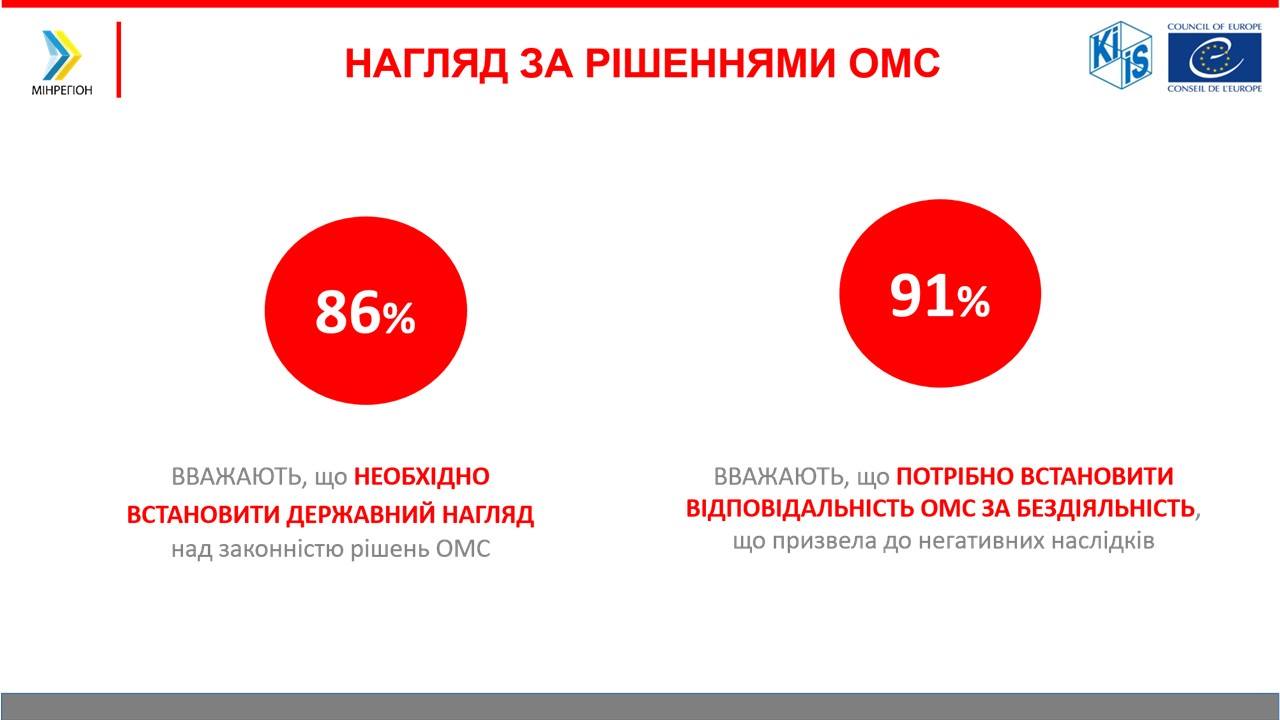 Соціологія абсолютно доводить, що люди хочуть аби їхні органи місцевого самоврядування несли відповідальність за порушення їхніх прав. Так 91% респондентів дотримуються думки, що потрібно встановити відповідальність органів місцевого самоврядування за бездіяльність, у вигляді дострокового припинення повноважень. Щодо того, який орган має ухвалювати рішення щодо дострокового припинення повноважень, то 42% вважають, що має бути проведений референдум, 17% покладають відповідальність на суд і місцеву державну адміністрацію/префекта, 4% назвали Верховну Раду і лише 3% – Президента.