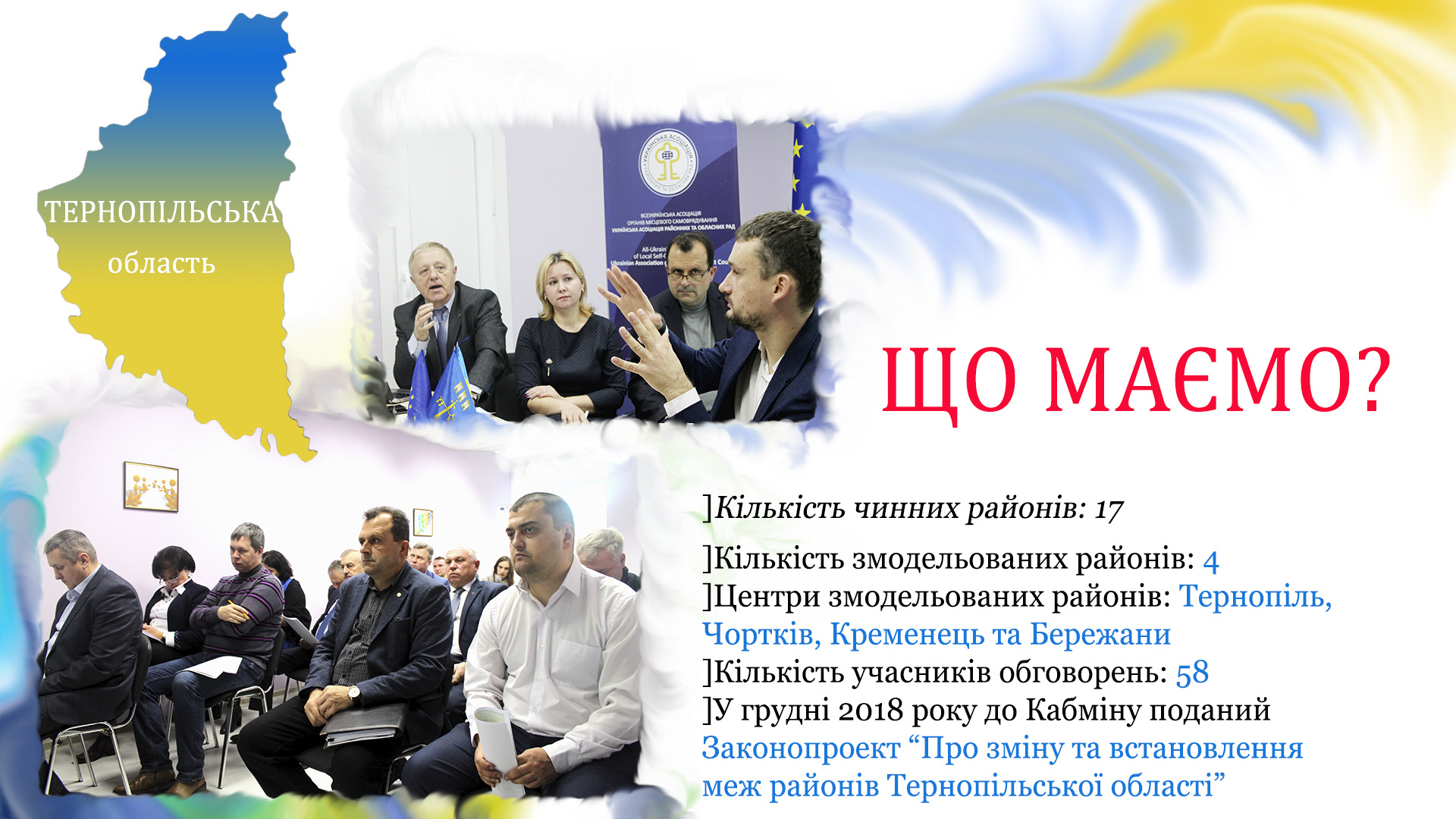 До честі Української асоціації районних та обласних рад, тут першими не лише почали озвучувати проблему неефективних районів на загальнодержавному рівні, а й запропонували своє бачення її розв’язання. Заручившись розумінням у Мінрегіоні та підтримкою Програми Ради Європи «Децентралізація і реформа місцевого самоврядування в Україні», в УАРОРі здійснили пілотний проект «Моделювання адміністративно-територіального устрою в Донецькій, Луганській, Тернопільській та Харківській областях на новій територіальній основі».