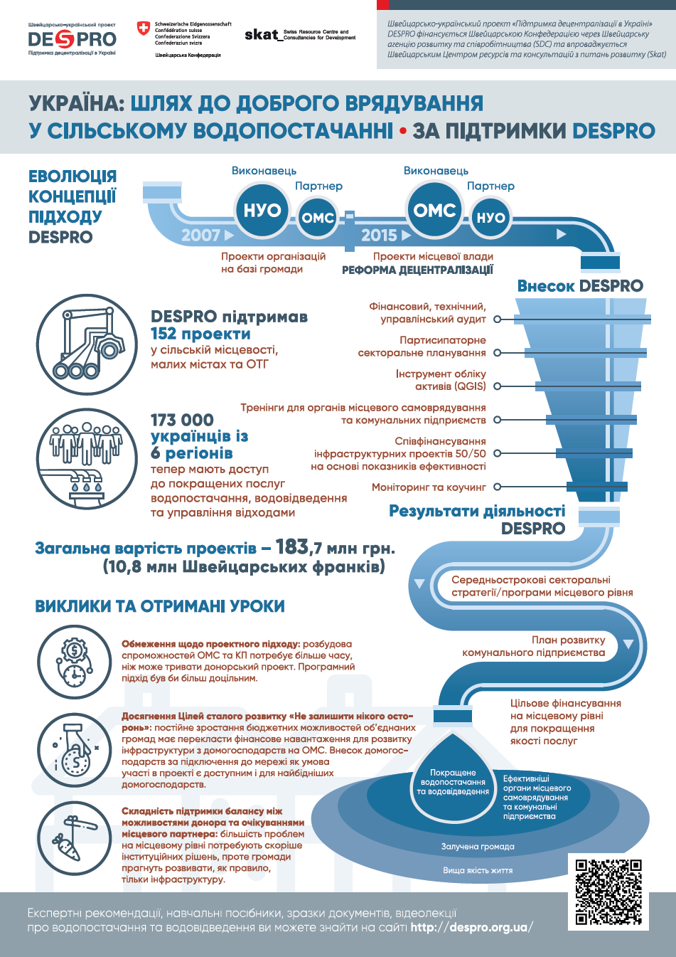 Швейцарсько-український проект «Підтримка децентралізації в Україні» DESPRO виклав свій багаторічний досвід в сфері водопостачання та водовідведення у короткій інфографіці (ЗАВАНТАЖИТИ).