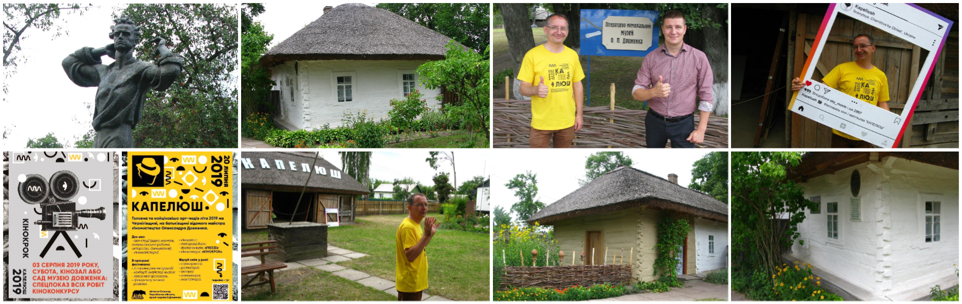Андрій Ткач, як і бронзовий Довженко, теж впевнено дивиться у майбутнє. Щоправда, воно у нього не пафосне, як у пам’ятника, а цілком конкретне, вимірюване і зрозуміле. Пан Андрій мріє про розвиток кінофестивалю, який ось вже двічі відбувся у Сосниці. Саме тому він одягнув сьогодні яскраво-жовту футболку з логотипом цього фестивалю. З неї, наче з афіші, я дізнаюся, що «20 липня 2019 року, у смт Сосниця, музеї-садибі О.Довженка за підтримки Міністерства культури України, Державної театрально-видовищної агенції та Арт-резиденції Олександра Довженка відбудеться кінофестиваль «Капелюш».