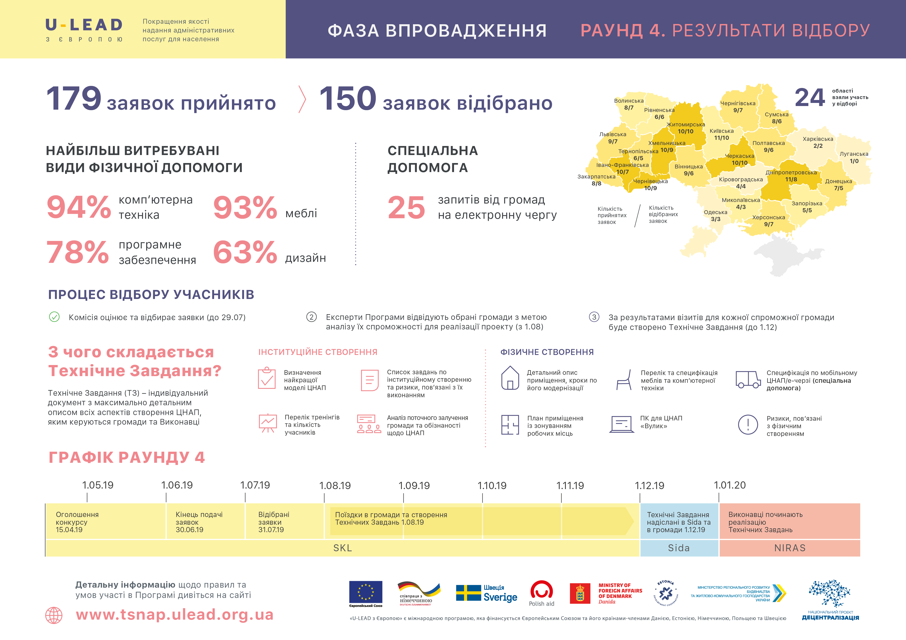 Експертна комісія проаналізувала 179 заявок із 24 областей України та відібрала 150 для подальшого аналізу спроможності громад та розробки індивідуальних технічних завдань для створення чи модернізації ЦНАП.