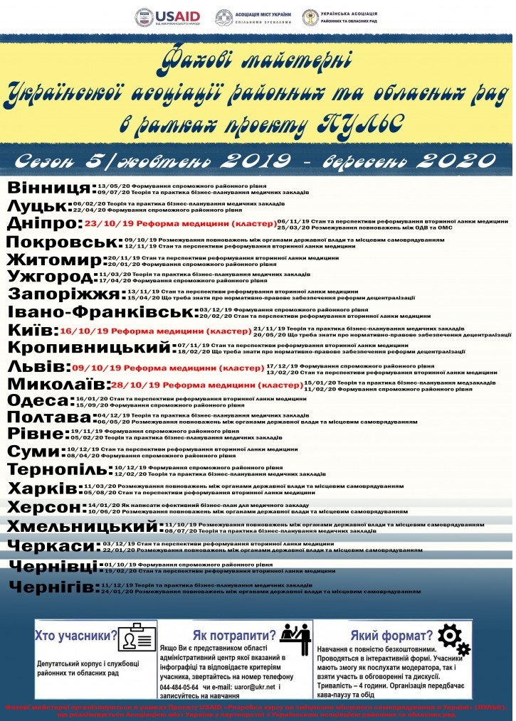 У жовтні стартував завершальний 5 сезон безкоштовних фахових майстерень Української асоціації районних та обласних рад в рамках Проєкту ПУЛЬС. Навчання у зазначеному періоді триватимуть до вересня 2020 року. Покриття – вся Україна.