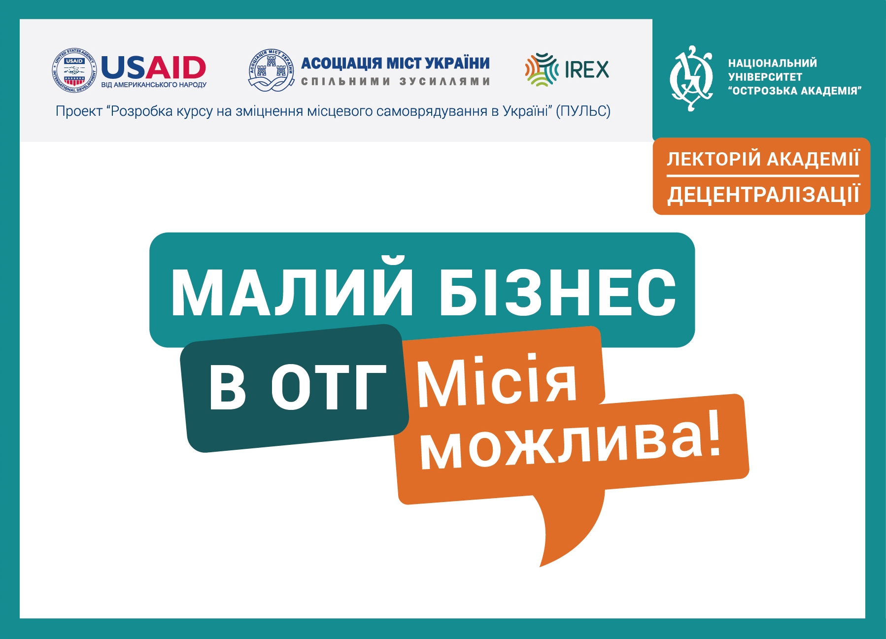 «Лекторій академії децентралізації» ініційовано Асоціацією міст України в рамках Проєкту USAID «Розробка курсу на зміцнення місцевого самоврядування в Україні» (ПУЛЬС), що реалізується у партнерстві з Радою міжнародних наукових досліджень та обмінів (IREX в Україні) та у співпраці з Національним університетом «Острозька академія».