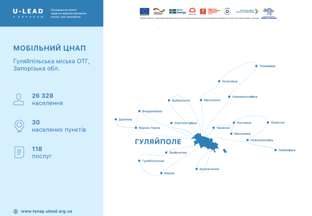 Завдяки співпраці з Програмою «U-LEAD з Європою» міськрайонний Центр надання адміністративних послуг у місті Гуляйполе пройшов інституційну модернізацію і тепер надаватиме 26 тисячам жителів громади та району 119 адміністративних послуг. 118 з них мешканці 59 населених пунктів Гуляйпільської району зможуть у мобільному ЦНАП, який також розпочав роботу за підтримки Програми.