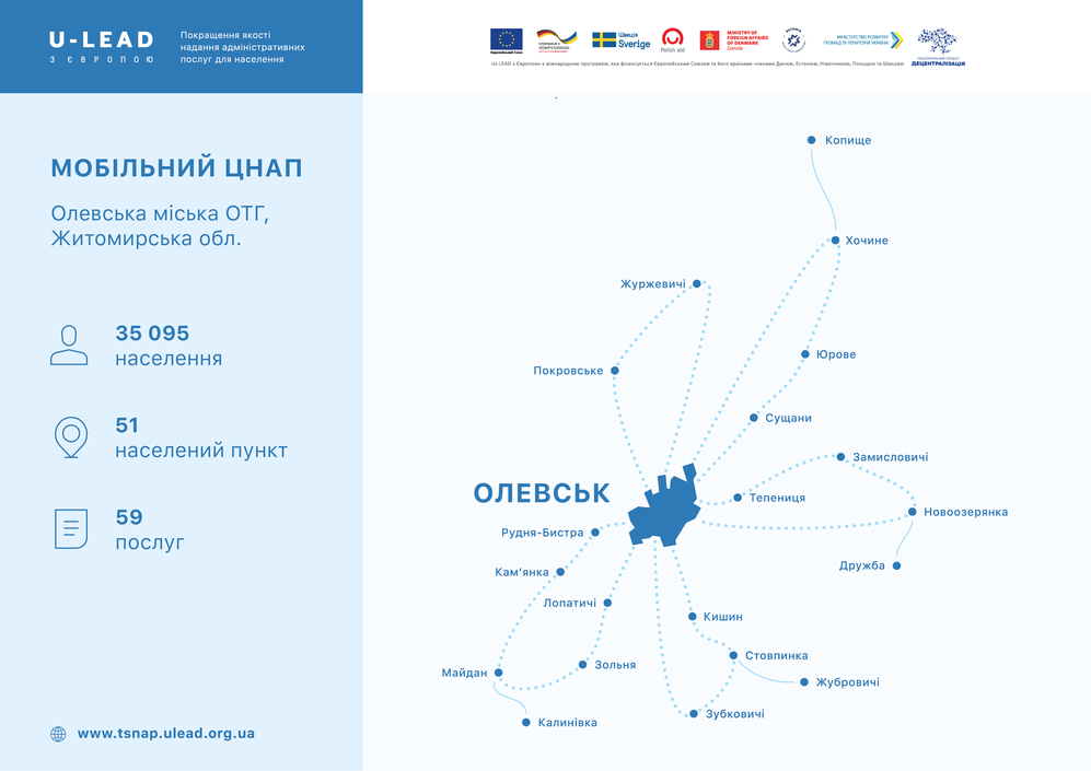 В Олевській міській громаді Житомирської області, яка є найбільшою за площею в Україні – 2010,9 кв. км, почав роботу мобільний центр надання адміністративних послуг, створений завдяки партнерству громади з Програмою «U-LEAD з Європою». «ЦНАП на колесах» буде працювати щоденно та обслуговувати майже 35 000 мешканців 51 населеного пункту.