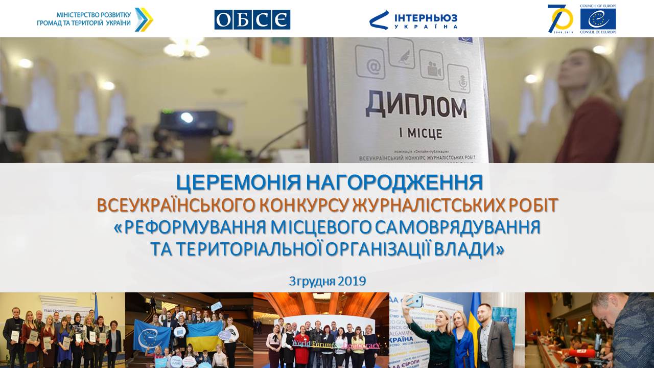 3 грудня о 10:00 у Міністерстві розвитку громад та територій України пройде щорічна церемонія нагородження авторів журналістських робіт, які перемогли у Всеукраїнському конкурсі журналістських робіт «Реформування місцевого самоврядування та територіальної організації влади» у 2019 році.