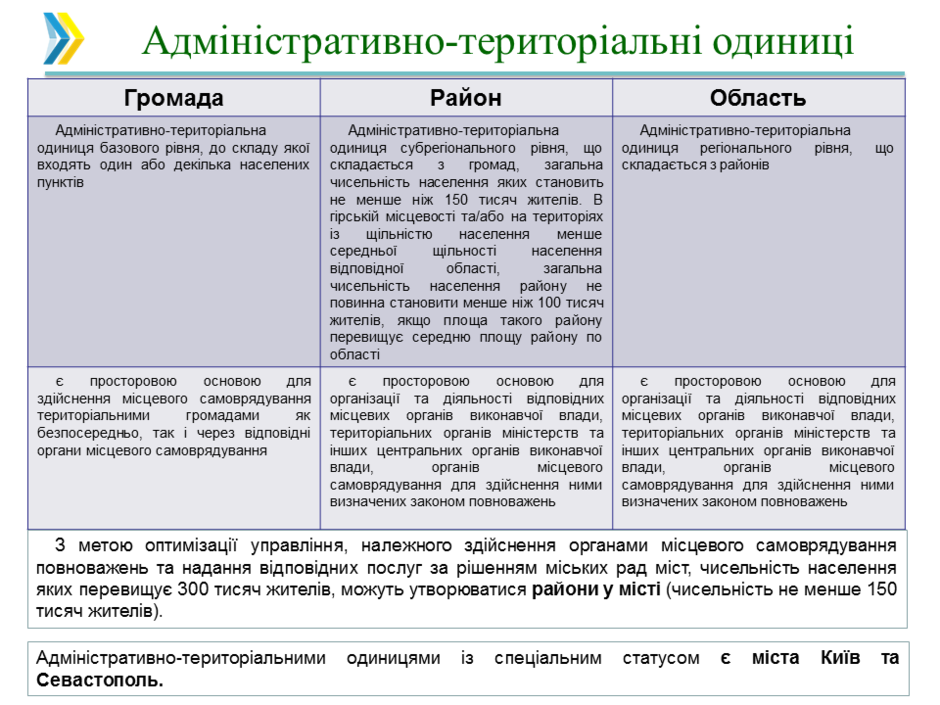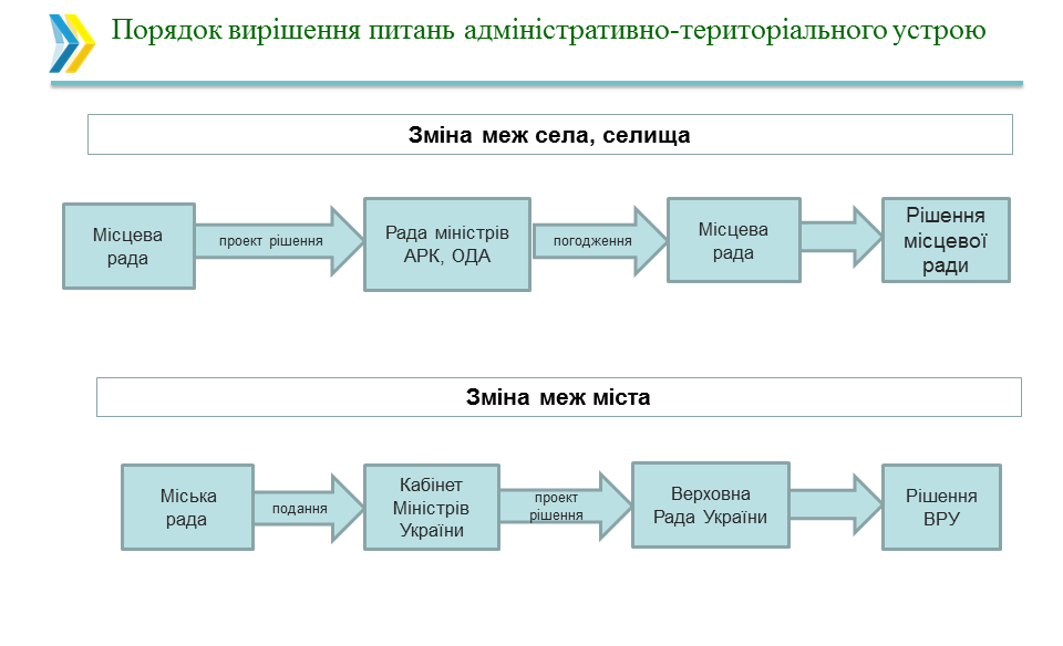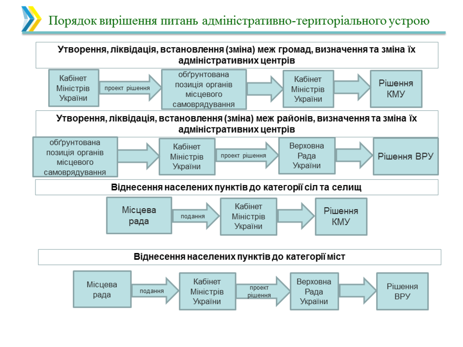В Мінрегіоні деталізували, що схваленим Урядом законопроектом вводяться поняття адміністративно-територіального устрою України, адміністративно-територіальної одиниці, населеного пункту та інші. Також встановлюються засади, на яких будується адміністративно-територіальний устрій та органи, до повноважень яких належить розгляд і вирішення цих питань. Врегульовується і порядок утворення та ліквідації адмінтеродиниць, встановлення і зміна їх меж, віднесення населених пунктів до категорії сіл, селищ , міст, найменування і перейменування населених пунктів, адміністративно-територіальних одиниць.