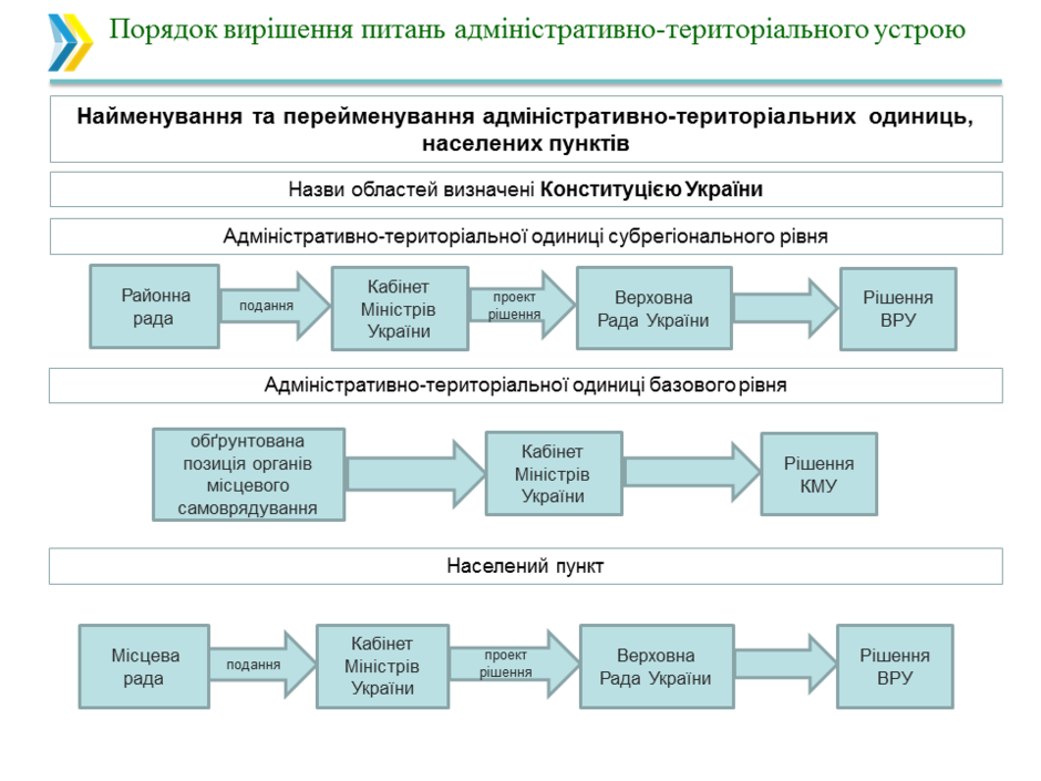 Нагадаємо, Закон «Про географічні назви» визначає правові основи регулювання відносин та діяльності, пов’язаних із встановленням назв географічних об’єктів, а також унормуванням, обліком, реєстрацією, використанням та збереженням географічних назв. І цим же законом визначено, що порядок найменування та перейменування географічних об'єктів, що складають систему адміністративно-територіального устрою України, визначається окремим законом. Отже таким законом має стати сього схвалений законопроект «Про засади адміністративно-територіального устрою України».