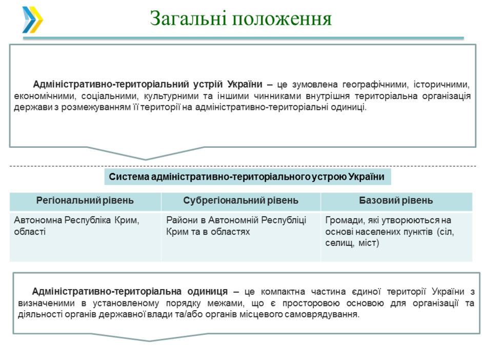 В Україні законодавчо визначать основні засади адміністративно-територіального устрою України, порядку утворення, ліквідації, встановлення і зміни меж адміністративно-територіальних одиниць та населених пунктів. 27 грудня Уряд схвалив проект Закону «Про засади адміністративно-територіального устрою України» - один з пакету законопроектів децентралізації.