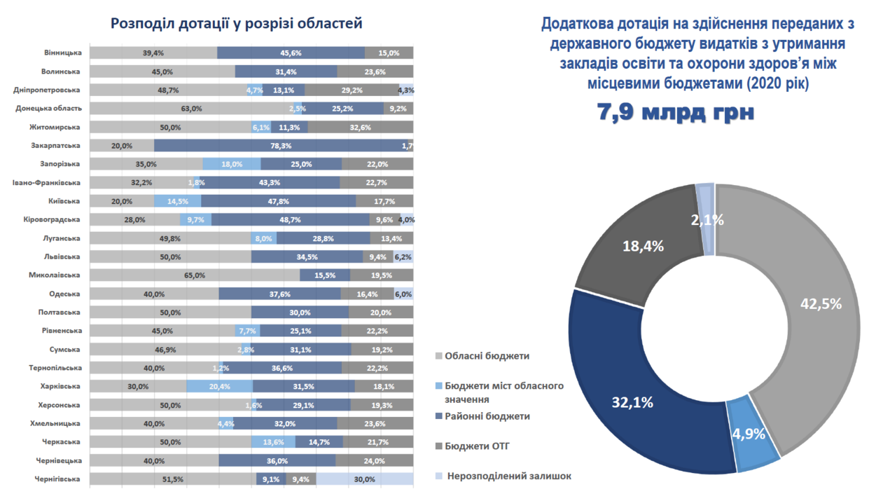 Стосовно обласних бюджетів, то частка додаткової дотації, яка залишається в їхньому розпорядженні, становить від 20% (Закарпатська, Київська області) до понад 60% (Миколаївська – 65%, Донецька – 63%) (Див. інфографіку).