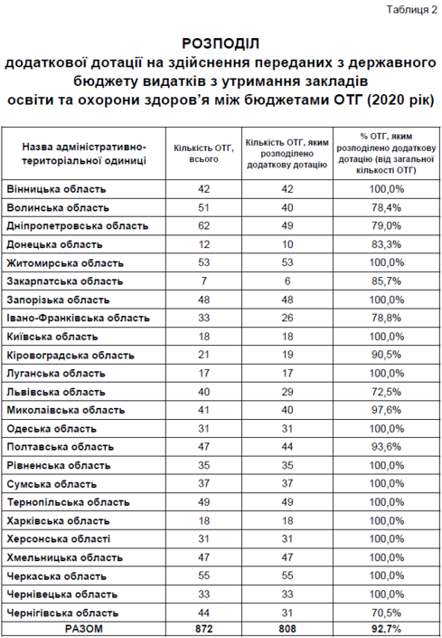 Слід зазначити, що із 872 бюджетів об’єднаних територіальних громад (далі – ОТГ), які у 2020 році мають прямі міжбюджетні відносини з державним бюджетом, додаткову дотацію на стадії затвердження бюджету не отримали 64 ОТГ або 7,3% від загальної кількості. У 14и областях кошти додаткової дотації розподілені між усіма існуючими у відповідній області бюджетами ОТГ (Таблиця 2).