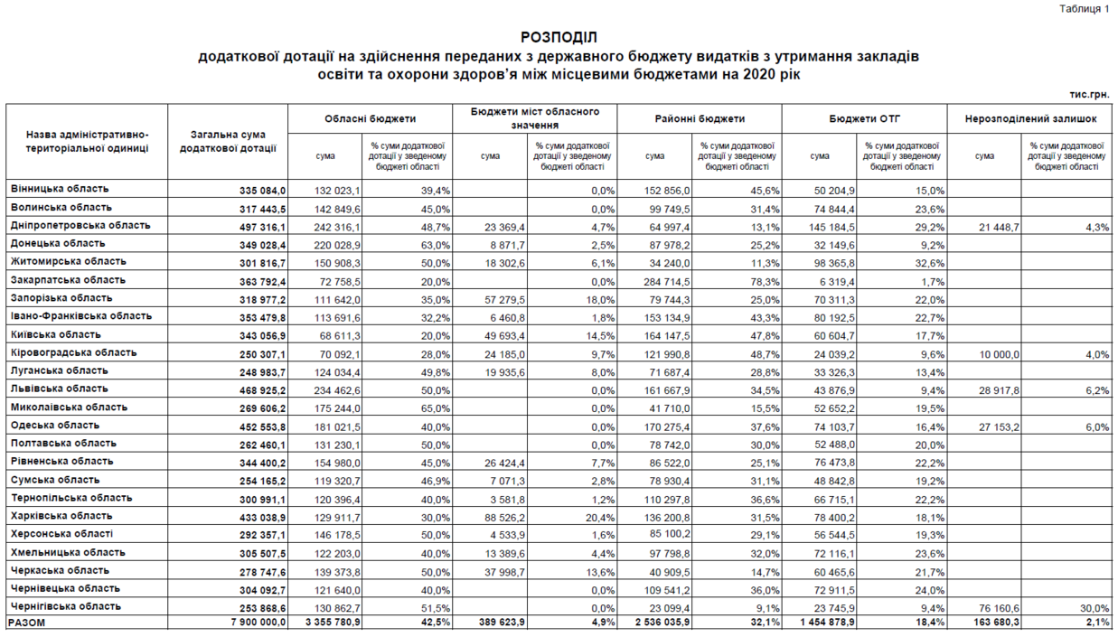 Аналіз розподілу додаткової дотації між місцевими бюджетами України на 2020 рік (Таблиця 1) свідчить, що: