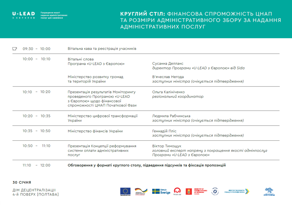 30 січня команда напряму з покращення якості надання адмінпослуг для населення Програми «U-LEAD з Європою» проведе Круглий стіл "Фінансова спроможність ЦНАП та розміри адміністративного збору за надання адміністративних послуг".