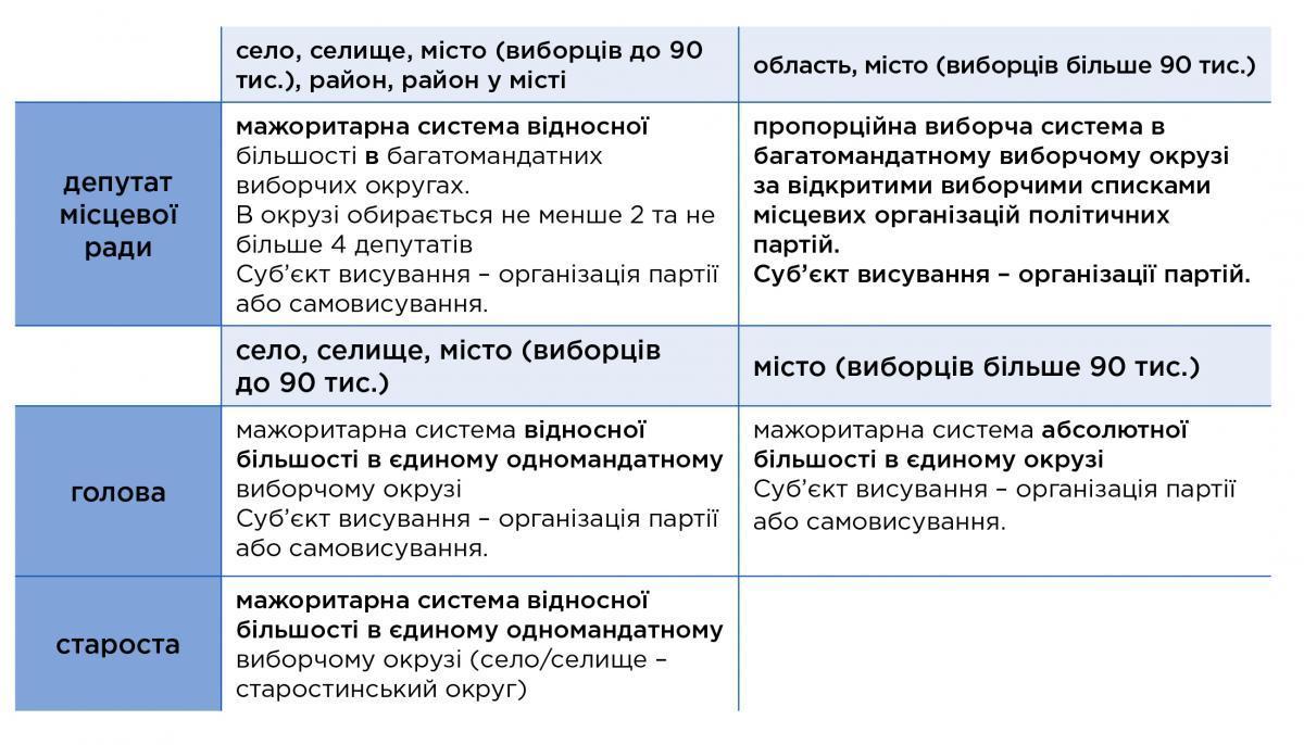 На виборах депутатів місцевих рад буде застосовуватися дві різні виборчі системи, залежно від типу виборів та величини адміністративно-територіальних одиниць: