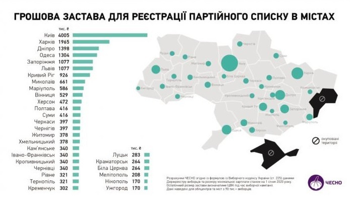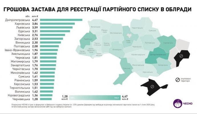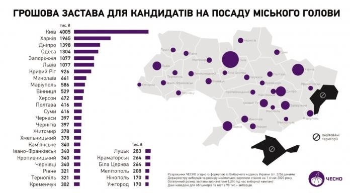 Грошова застава застосовується виключно на місцевих виборах до обласних рад, а також міських рад та міських голів у містах з кількістю виборців більше 90 тис. Для місцевих організацій партій, які висунули виборчий список кандидатів у депутати обласної чи міської ради та кандидата на посаду міського голови, а також для особи, яка висувається кандидатом на посаду міського голови (з кількістю виборців більше 90 тис.), грошова застава розраховується як результат множення чотирьох розмірів мінімальної заробітної плати, встановленої на день початку виборчого процесу, на кожні 10 тисяч виборців.