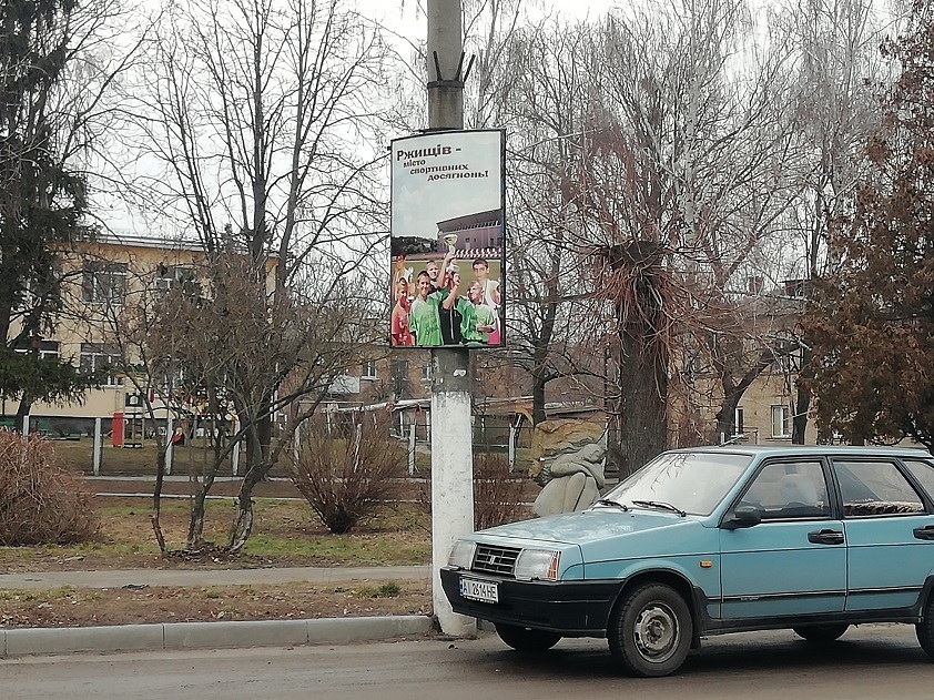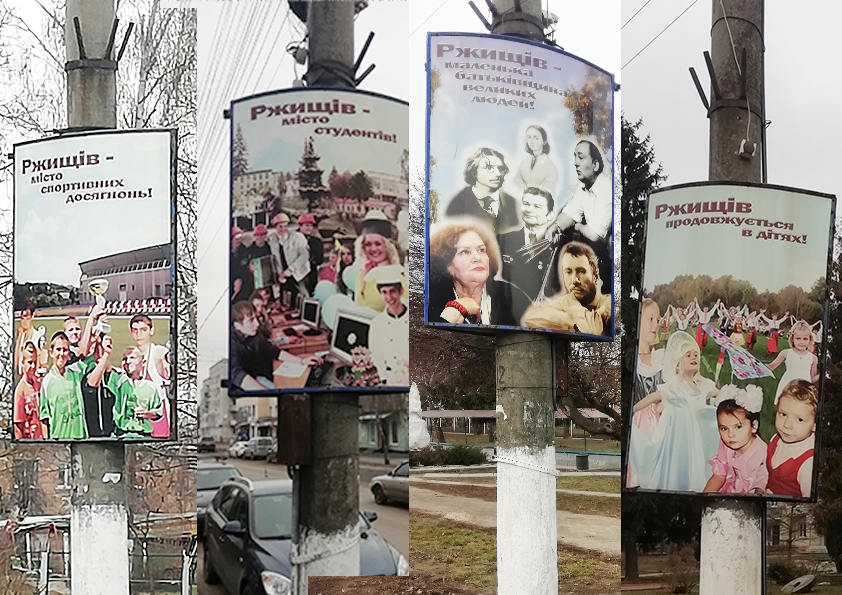 Ржищівські рекламні конструкції, які не рекламують туристичні можливості громади, натомість повідомляють жителям, що Ржищів – «місто спортивних досягнень, місто студентів, маленька батьківщина великих людей (та місто, яке продовжується в дітях».