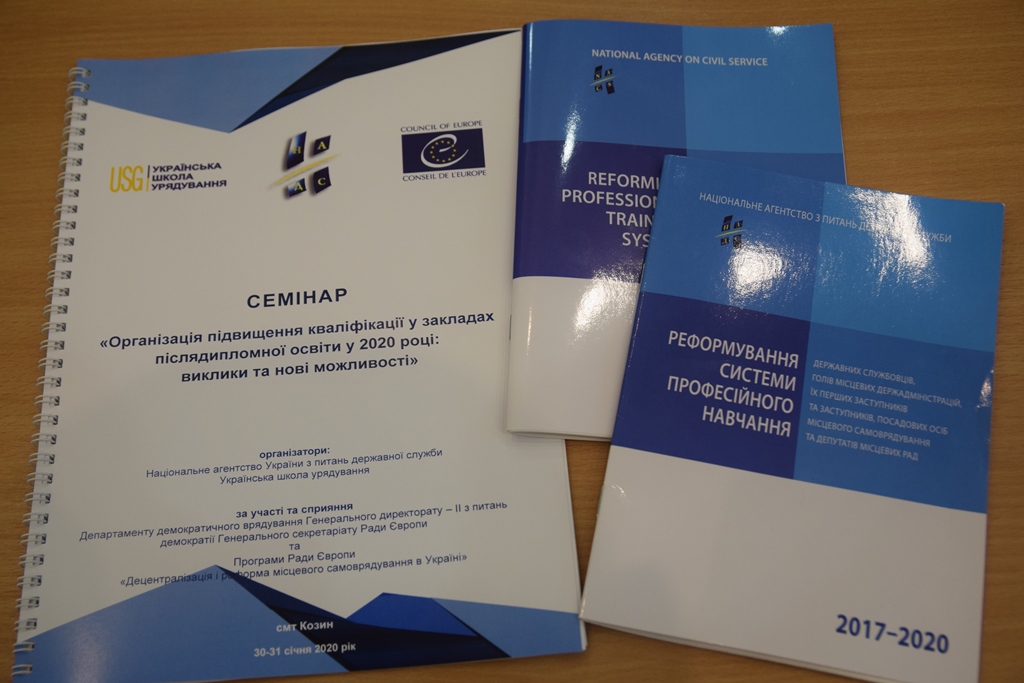 30-31 січня 2020 року Національне агентство України з питань державної служби (НАДС) у співпраці з Програмою Ради Європи «Децентралізація і реформа місцевого самоврядування в Україні» організувало на базі Української школи урядування семінар «Організація підвищення кваліфікації у закладах післядипломної освіти у 2020 році: виклики та нові можливості».