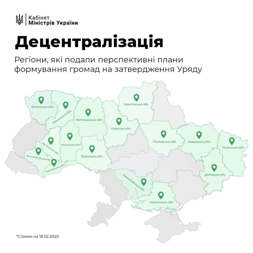 Станом на 18 лютого, 16 обласних державних адміністрацій подали до Кабінету Міністрів проекти перспективних планів. Інші мають зробити це максимум до п’ятниці, 21 лютого.