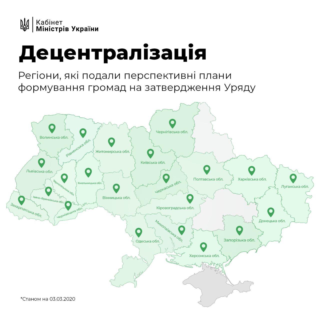 Станом на 3 березня, 22 обласні державні адміністрації - усі, крім Дніпропетровської та Сумської - подали до Кабінету Міністрів проекти перспективних планів, що покривають усю територію області.