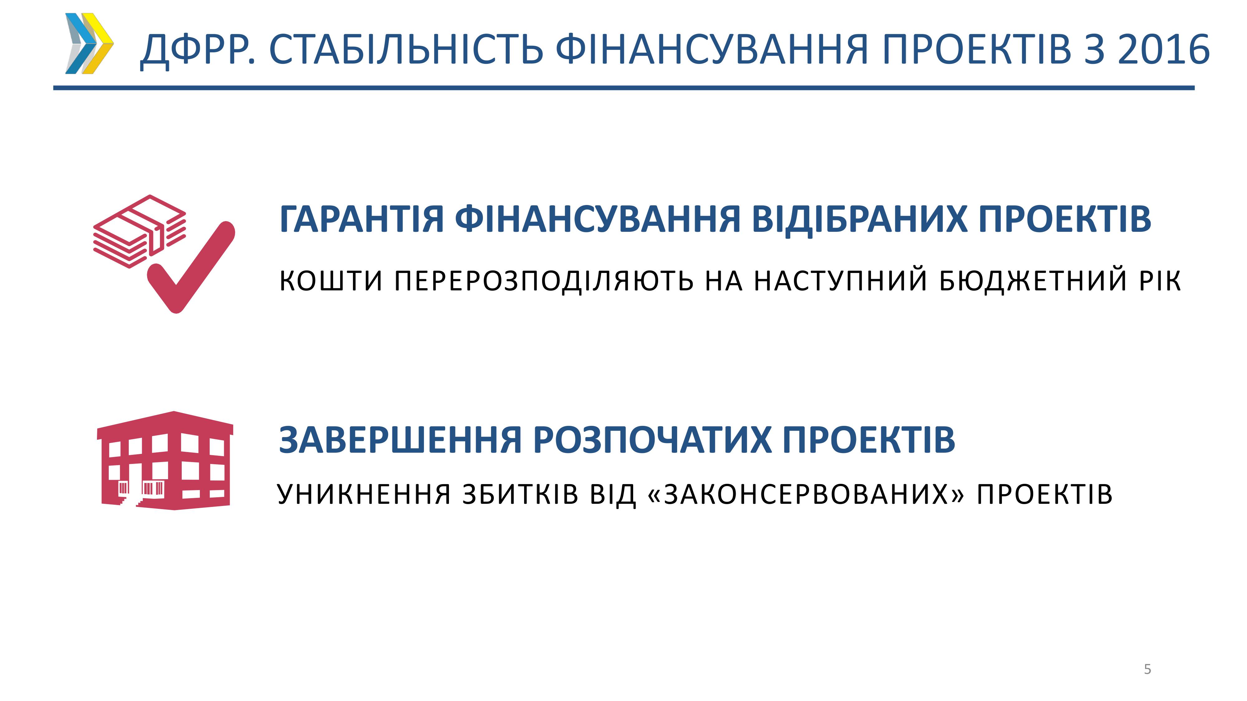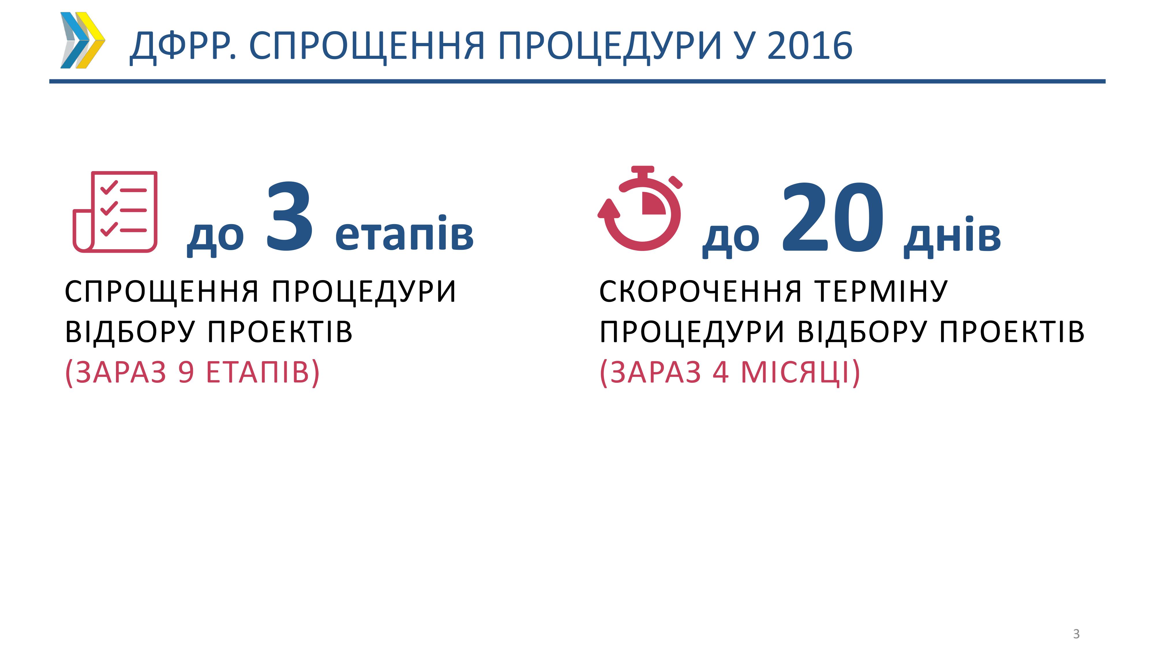 За словами урядовця, зараз процедура затвердження розподілу коштів ДФРР на інвестиційні програми і проекти регіонального розвитку триває до 4-х місяців. Відповідно, це скорочує час на їх реалізацію, а виділення фінансування розпочинається не з початку року, а у більшості випадків у кінці ІІІ – на початку IV кварталів року.
