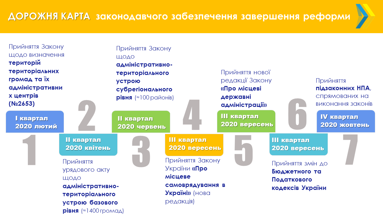 Заступник міністра нагадав журналістам про план завершення головного етапу реформи у 2020 році. Для цього потрібно зробити небагато: затвердити адміністративно-територіальний устрій на рівні громад та районів, розподілити повноваження і ресурси між рівнями місцевого самоврядування, між центральною і місцевою владою, провести вибори на новій територіальній основі.