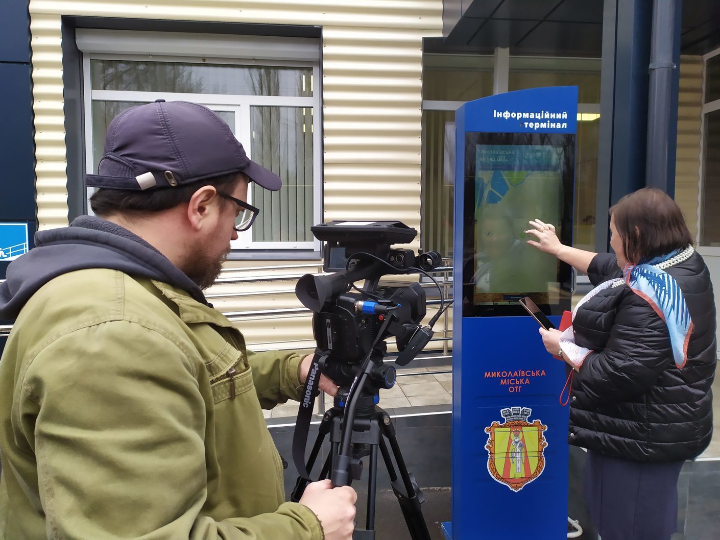 Інформаційний термінал з’явився у Миколаївській ОТГ в рамках проекту міжнародної технічної допомоги «Онлайн-сервіси: безпечна громада». Усі сервіси терміналу доступні й на мобільному телефоні, демонструє Олена Цикунова, голова Миколаївської ОТГ. Такий пристрій дозволяє прочитати новини про громаду, повідомити про правопорушення, записатись на прийом, узяти участь у опитуванні та дізнатись про маршрути та розклад руку транспорту, зв’язатись з дільничним офіцером поліції. Усе це доступно також в мобільному додатку.