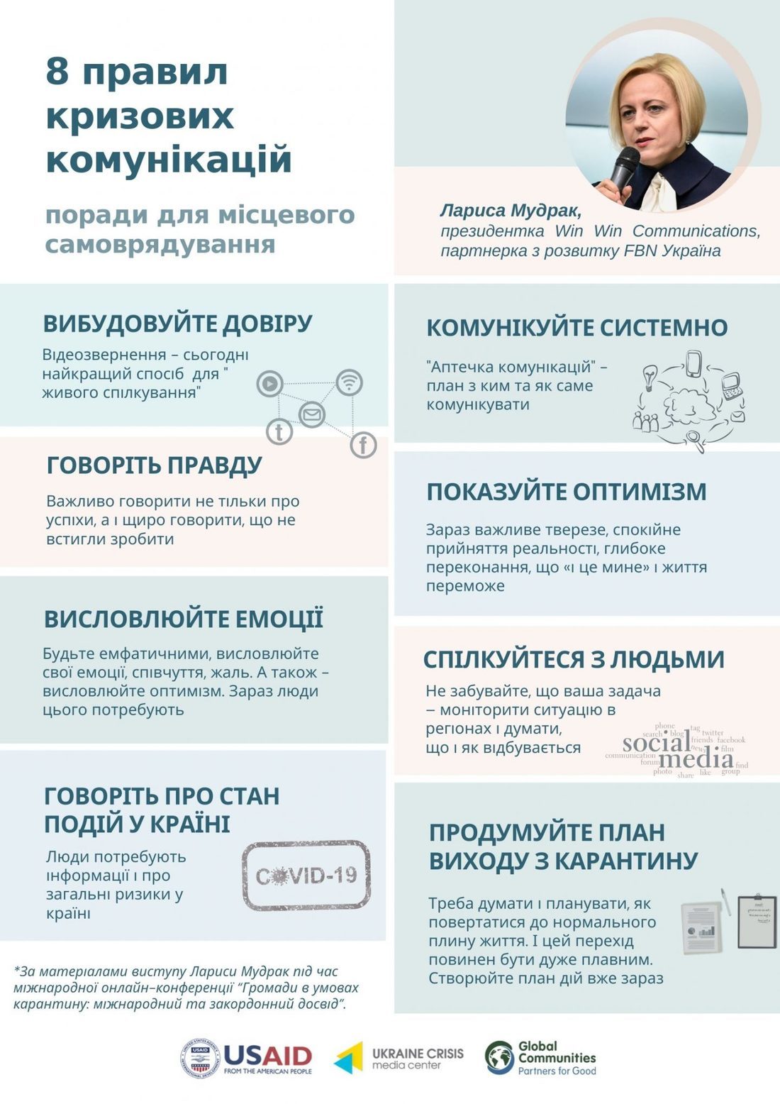 За матеріалами виступу Лариси Мудрак, президентки Win Win Communications, партнерки з розвитку FBN Україна, під час міжнародної онлайн-конференції “Громади в умовах карантину: міжнародний та закордонний досвід”.