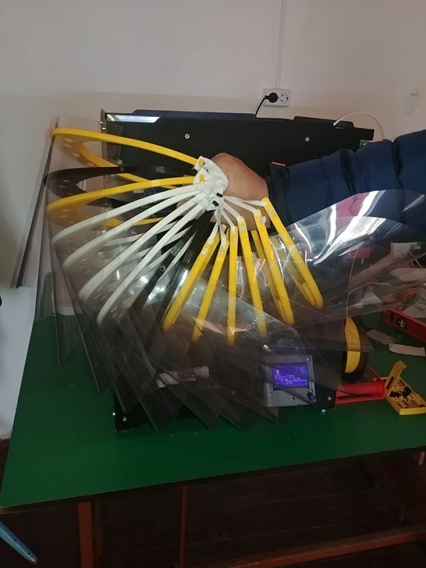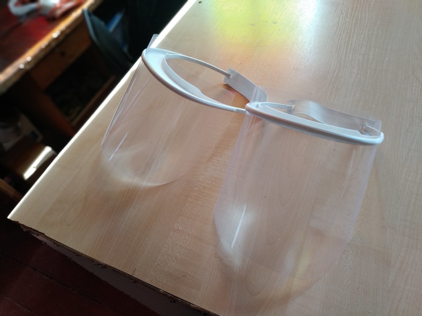 Конструкція щитка мінімальна — тримач, який друкують на 3D-принтері із PLA пластику, резинка для кріплення та екран із прозорого пластику. Один тримач виготовляється дві години. Принтер за добу може видати 5-6 штук.