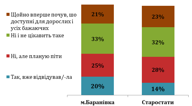 За даними проведеного у лютому 2020 року опитування (опитано 611 респондентів у місті Баранівка та у всіх 12 старостатах ОТГ методом face-to-face, статистична похибка не перевищує ±4,0%), 17% дорослих мешканців ОТГ (20% у м.Баранівці та 14% у старостатах) уже відвідали коворкінги хоча б один раз, ще 26% планують це зробити (25% у м.Баранівці та 28% у старостатах).
