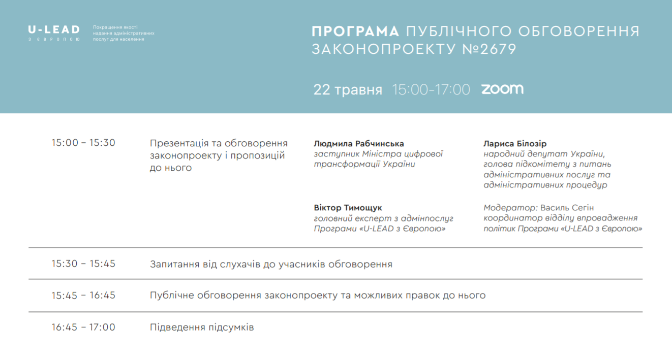 Захід, організований напрямом з покращення якості надання адмінпослуг для населення Програми «U-LEAD з Європою», має на меті зібрати позиції зацікавлених сторін щодо ключових змін, які пропонує законопроєкт. За результатами обговорення будуть підготовлені та опубліковані можливі правки до розгляду законопроєкту у другому читанні.