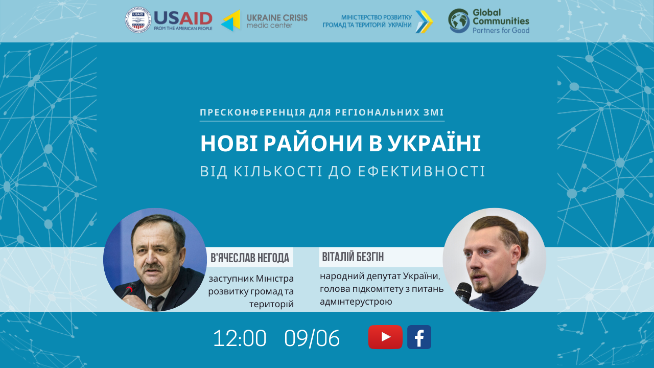 9 червня о 12:00 відбудеться онлайн-пресконференція на тему: «Нові райони в Україні: від кількості до ефективності», де регіональні журналісти зможуть поставити запитання щодо формування в Україні нових районів та їх законодавчої основи.