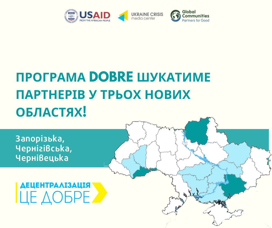 Програма USAID «Децентралізація приносить кращі результати та ефективність» (DOBRE) – це п’ятирічна програма, що виконується міжнародною організацією Глобал Комьюнітіз (Global Communities) та фінансується Агентством США з міжнародного розвитку (USAID). Програма спрямована на посилення місцевого самоврядування та створення кращих умов для розвитку ОТГ, підвищення рівня залученості громадян до прийняття рішень та забезпечення підзвітності та прозорості в громадському управлінні. З 2016 року програма USAID DOBRE підтримала 75 громад в 7 цільових областях: Дніпропетровській, Івано-Франківській, Харківській, Херсонській, Кіровоградській, Миколаївській та Тернопільській. З червня 2020 Програма розпочинає свою роботу ще в трьох областях: Запорізькій, Чернівецькій, та Чернігівській.
