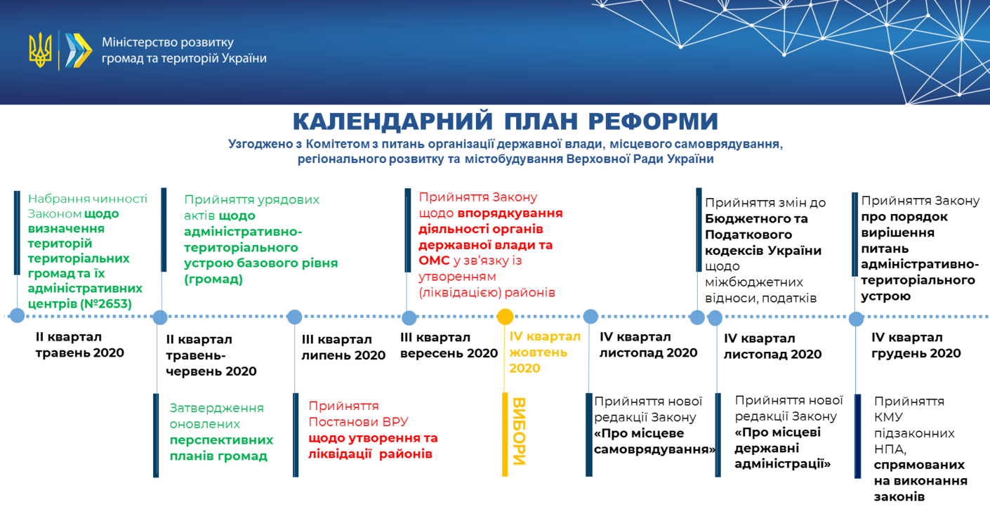 2020 рік насичений завданнями реформи місцевого самоврядування та територіальної організації влади. За пів року Уряд затвердив перспективні плани формування територій спроможних громад 24 областей, визначив адмінцентри та затвердив території територіальних громад, направив на розгляд парламенту проект Постанови щодо утворення та ліквідації районів і законопроект щодо впорядкування діяльності органів державної влади та органів місцевого самоврядування у зв’язку з утворенням і ліквідацією районів. Це та частина правової основи реформи, яку парламенту необхідно встигнути розглянути до завершення поточної сесії (до середини липня). Далі – призначення чергових місцевих виборів на новій територіальній основі та їх проведення.