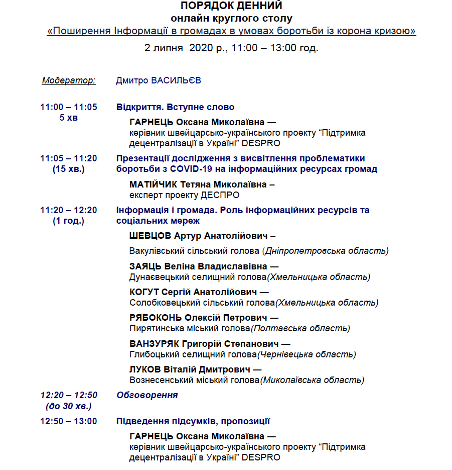 На круглому столі буде представлене та обговорюватиметься дослідження інформаційного наповнення офіційних сайтів органів місцевого самоврядування 96-ти громад. Дослідження проведене Швейцарсько-українським проектом DESPRO, щоб вивчити роль інформаційних ресурсів органів місцевого самоврядування, а також антикризової інформаційної політики ОТГ в умовах коронакризи.