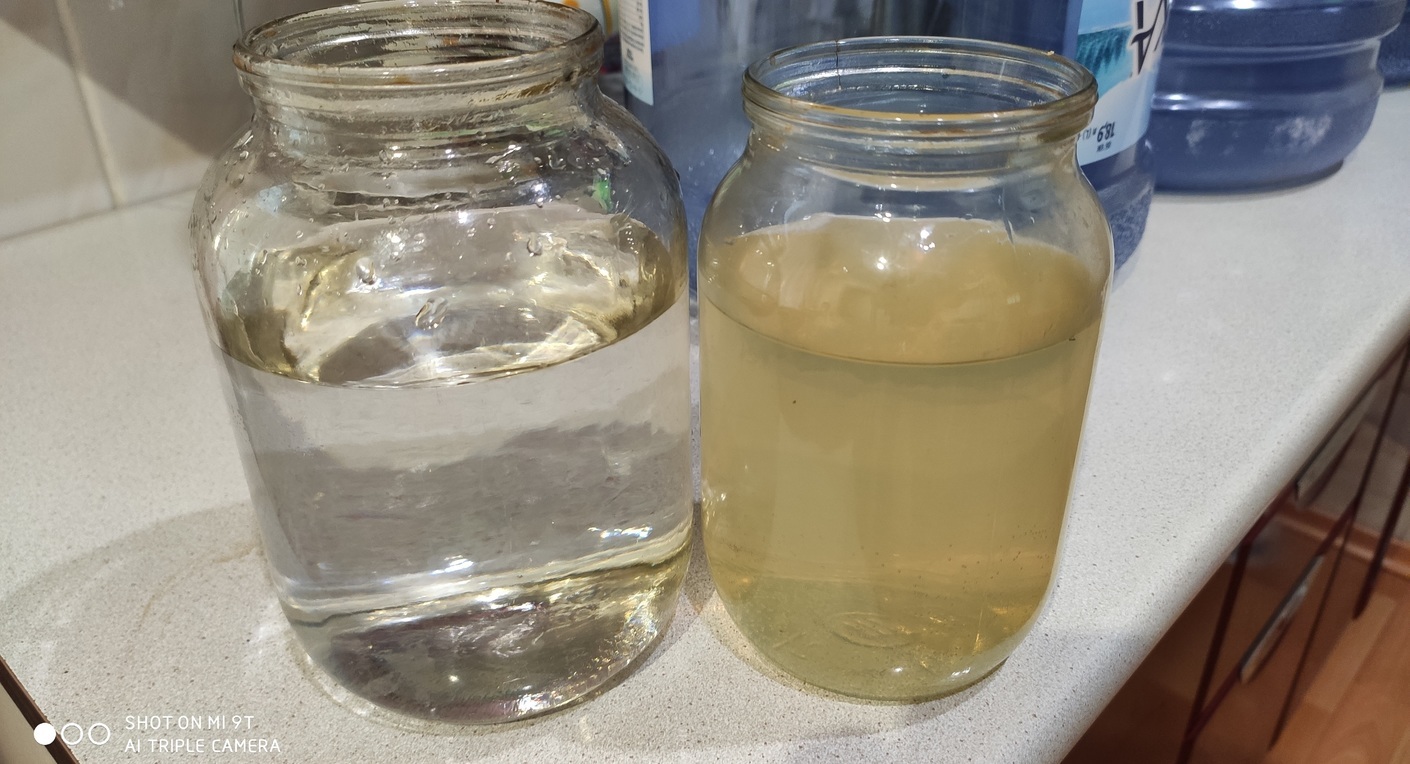 Вода, відстояна близько години. Ліворуч та, яка пройшла через фільтри у будинку Анатолія Хололєєнка, праворуч – звичайна