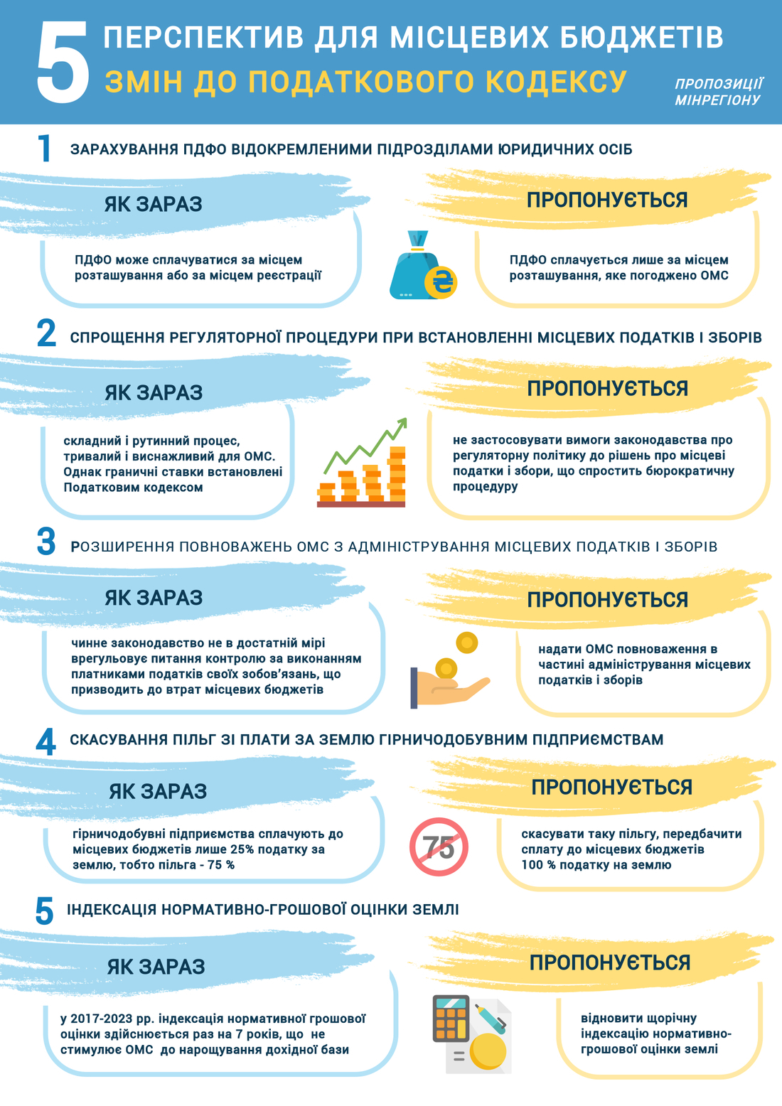 Мінрегіон підготував пропозиції змін до податкового законодавства, які розширять можливості нарощування надходжень до місцевих бюджетів. Пропозиції підготовлені в контексті реалізації завдань фінансової децентралізації і базуються на основоположному документі реформи - Концепції реформування місцевого самоврядування та територіальної організації влади. Про це повідомили в Офісі підтримки реформ при Мінрегіоні.