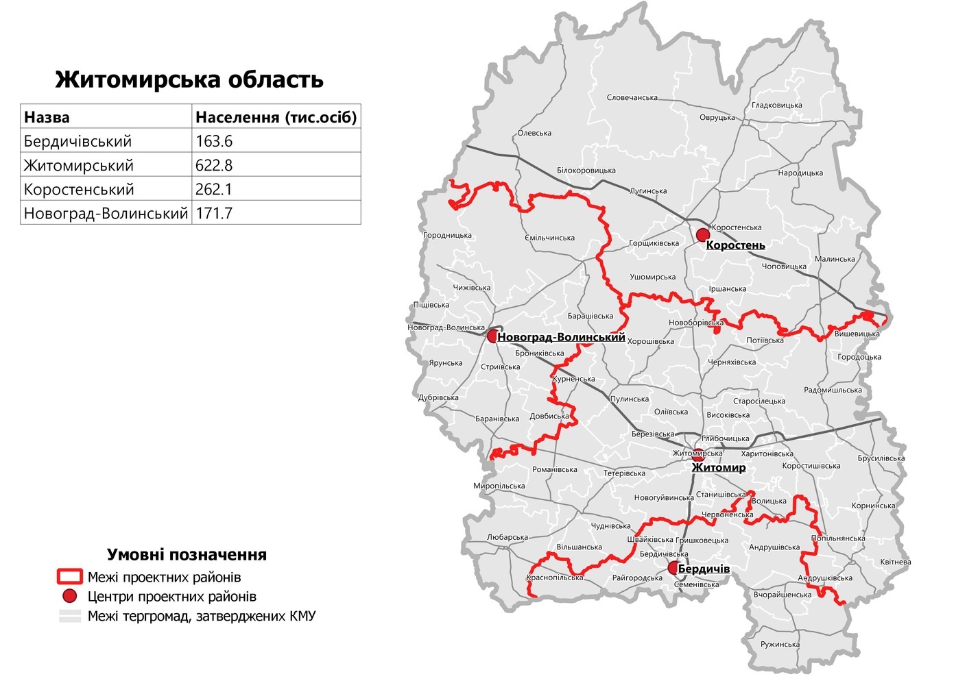 Житомирський район (з адміністративним центром у місті Житомир) у складі територій Андрушківської сільської, Березівської сільської, Брусилівської селищної, Високівської сільської, Вишевицької сільської, Вільшанської сільської, Волицької сільської, Глибочицької сільської, Городоцької селищної, Житомирської міської, Квітневої сільської, Корнинської селищної, Коростишівської міської, Курненської сільської, Любарської селищної, Миропільської селищної, Новоборівської селищної, Новогуйвинської селищної, Оліївської сільської, Попільнянської селищної, Потіївської сільської, Пулинської селищної, Радомишльської міської, Романівської селищної, Станишівської сільської, Старосілецької сільської, Тетерівської сільської, Харитонівської сільської, Хорошівської селищної, Черняхівської селищної, Чуднівської міської територіальних громад, затверджених Кабінетом Міністрів України;