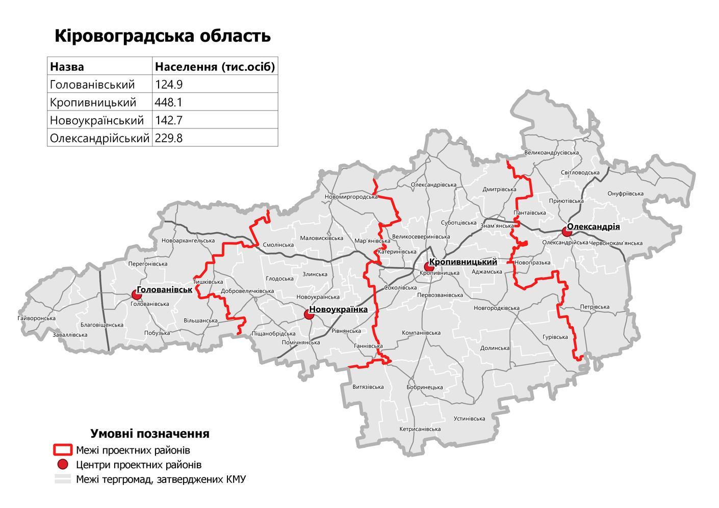 Новоукраїнський район (з адміністративним центром у місті Новоукраїнка) у складі територій Ганнівської сільської, Глодоської сільської, Добровеличківської селищної, Злинської сільської, Маловисківської міської, Мар’янівської сільської, Новомиргородської міської, Новоукраїнської міської, Піщанобрідської сільської, Помічнянської міської, Рівнянської сільської, Смолінської селищної, Тишківської сільської територіальних громад, затверджених Кабінетом Міністрів України;