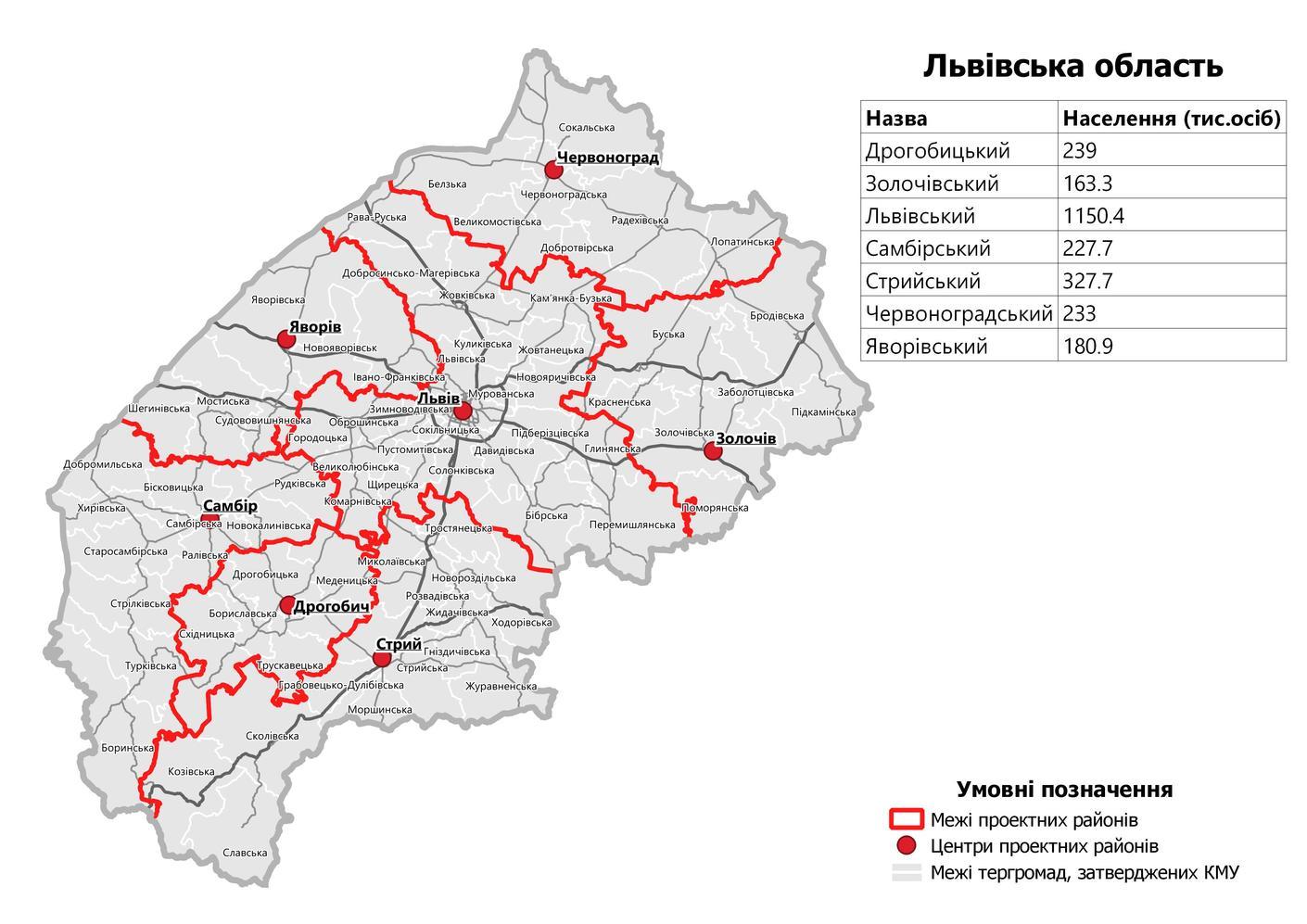 Львівський район (з адміністративним центром у місті Львів) у складі територій Бібрської міської, Великолюбінської селищної, Глинянської міської, Городоцької міської, Давидівської сільської, Добросинсько-Магерівської селищної, Жовківської міської, Жовтанецької сільської, Зимноводівської сільської, Кам’янка-Бузької міської, Комарнівської міської, Куликівської селищної, Львівської міської, Мурованської сільської, Новояричівської селищної, Оброшинської сільської, Перемишлянської міської, Підберізцівської сільської, Пустомитівської міської, Рава-Руської міської, Сокільницької сільської, Солонківської сільської, Щирецької селищної територіальних громад, затверджених Кабінетом Міністрів України;