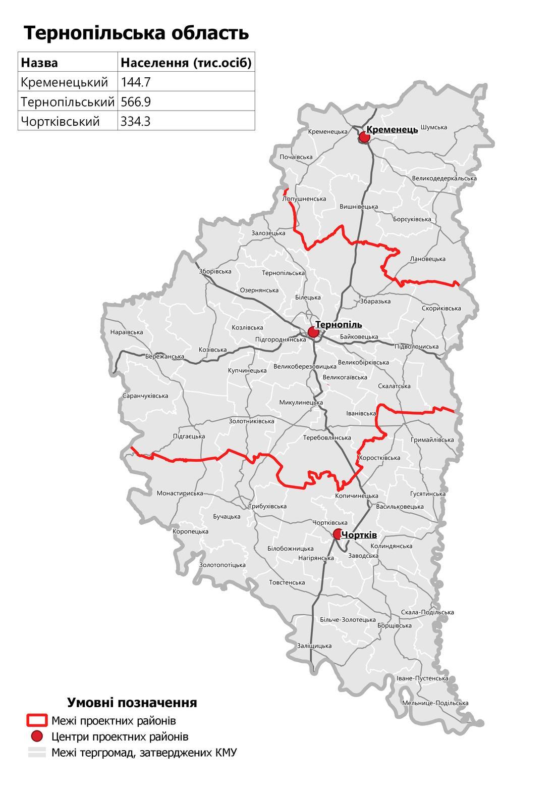 Тернопільський район (з адміністративним центром у місті Тернопіль) у складі територій Байковецької сільської, Бережанської міської, Білецької сільської, Великоберезовицької селищної, Великобірківської селищної, Великогаївської сільської, Залозецької селищної, Збаразької міської, Зборівської міської, Золотниківської сільської, Іванівської сільської, Козівської селищної, Козлівської селищної, Купчинецької сільської, Микулинецької селищної, Нараївської сільської, Озернянської сільської, Підволочиської селищної, Підгаєцької міської, Підгороднянської сільської, Саранчуківської сільської, Скалатської міської, Скориківської сільської, Теребовлянської міської, Тернопільської міської територіальних громад, затверджених Кабінетом Міністрів України;