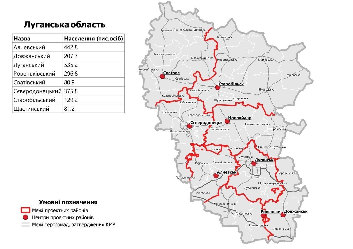 Ровеньківський район (з адміністративним центром у місті Ровеньки) у складі територій Антрацитівської міської, Ровеньківської міської, Хрустальненської міської територіальних громад, затверджених Кабінетом Міністрів України;