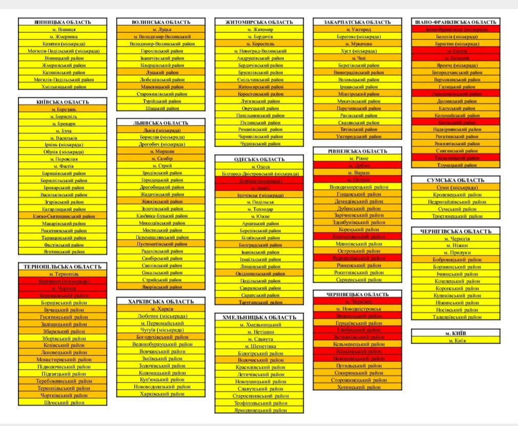 Відповідно до постанови Кабінету Міністрів України від 22.07.2020 №641 «Про встановлення карантину та запровадження посилених протиепідемічних заходів на території із значним поширенням гострої респіраторної хвороби COVID-19, спричиненої коронавірусом SARS-CoV-2» залежно від епідемічної ситуації в регіоні або районі чи місті обласного значення може бути встановлений рівень епідемічної небезпеки поширення COVID-19. Наразі визначено чотири рівні: «зелений», «жовтий», «помаранчевий» та «червоний». Рівні від «жовтого» по «червоний» один раз на сім днів встановлюються Державною комісією з питань техногенно-екологічної безпеки та надзвичайних ситуацій для території регіону або окремих адміністративно-територіальних одиниць регіону на основі таких ознак: