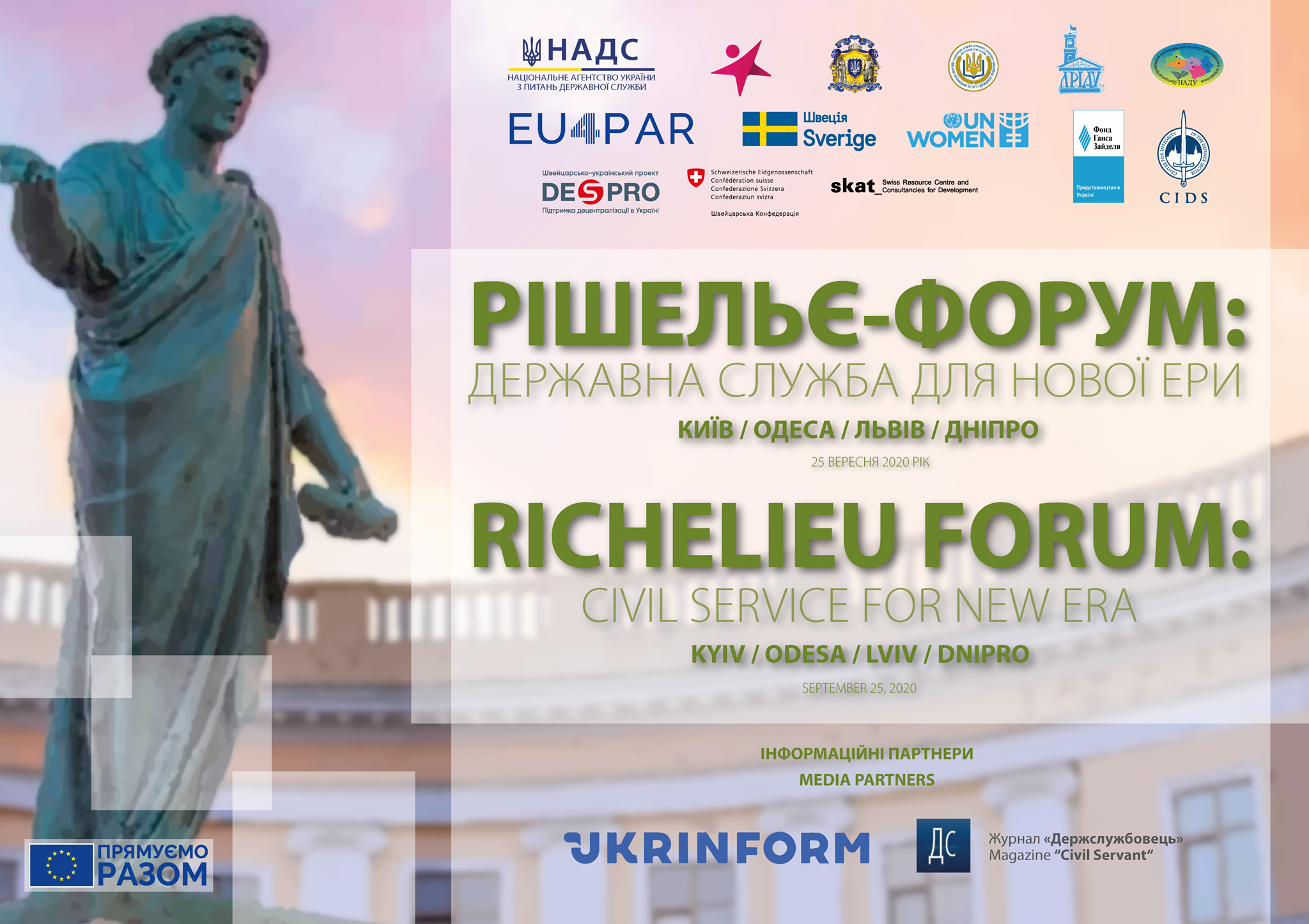 25 вересня 2020 року відбудеться «Рішельє-форум: державна служба для нової ери», який уже багато років поспіль є однією з головних платформ для міжнародного діалогу, обміну досвідом, практиками та сучасними тенденціями з актуальних питань підвищення ефективності державного управління і державної служби.