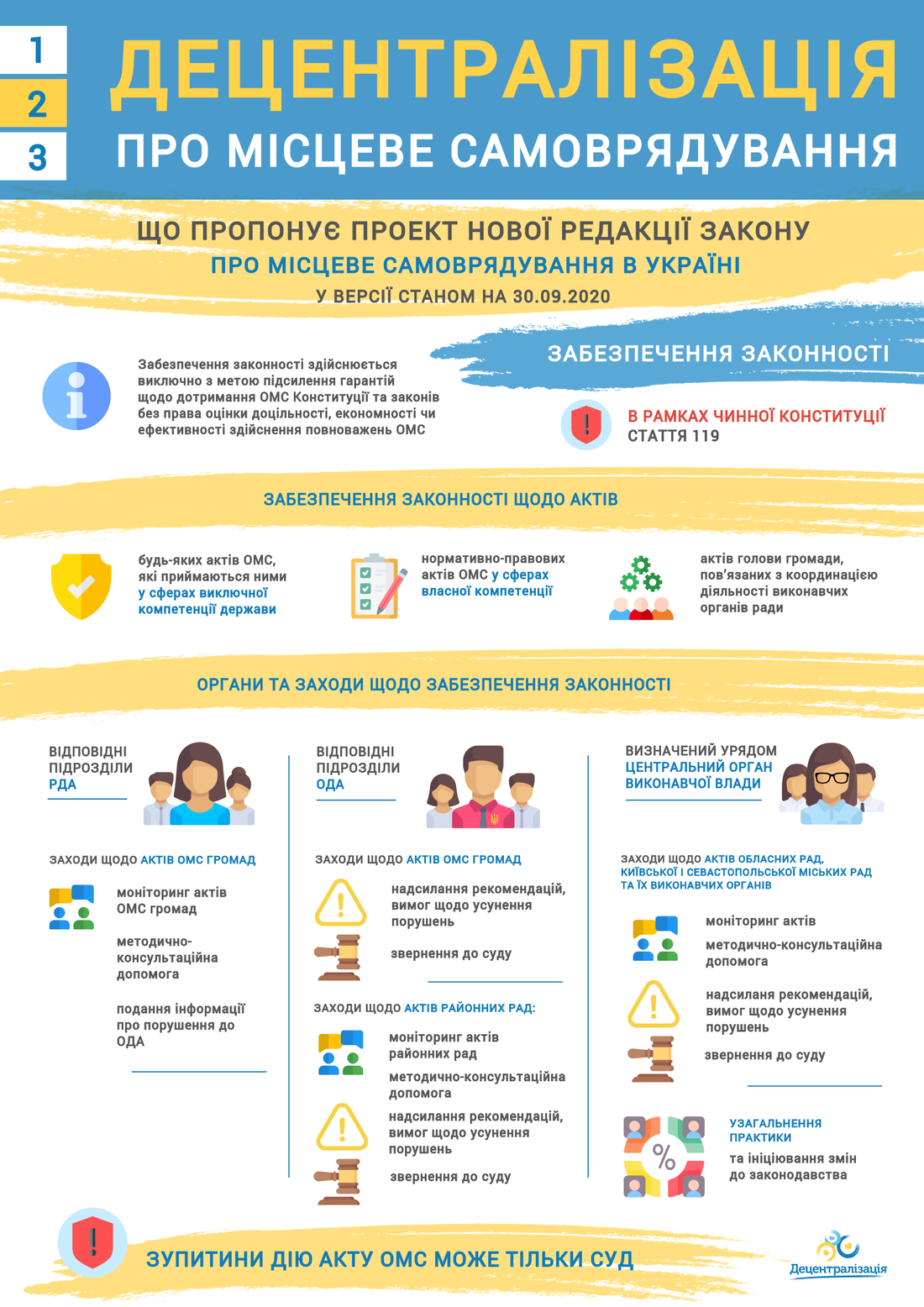 Щоб нагадати, що передбачає законопроект, «Децентралізація» спільно з Мінрегіоном підготувала три короткі інфографіки. У першій з них (переглянути) мова йшла про основні зміни, запропоновані проектом закону. У другій говоримо про забезпечення законності.