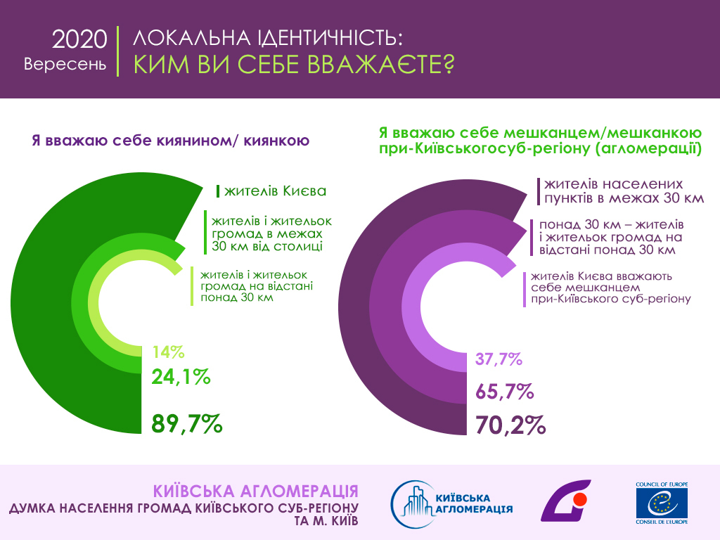 Тож не дивно, що з-поміж респондентів у громадах до 30 км від столиці вважають себе киянами (навіть за умови проживання поза нинішніми межами столиці) 24,1%, понад 30 км – 14%.