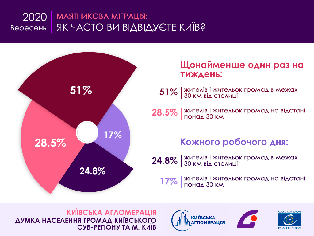 За даними Державної стратегії регіонального розвитку на період до 2027 року, щодня до столиці прямує майже 560 тисяч осіб – на роботу, навчання, за медичними, соціальними, адміністративними послугами тощо. Увечері всі вони залишають Київ і повертаються додому, переважна більшість – у населені пункти, розташовані у 30-60-тикілометровій зоні довкола головного міста країни.