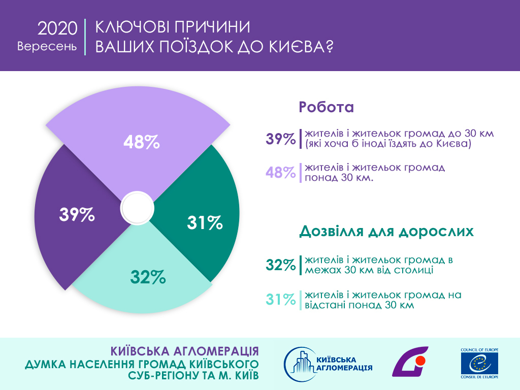 Вирішальна причина таких тривалих щоденних вояжів – робота для 47,9% респондентів і респонденток з громад, розташованих на відстані понад 30 км від Києва та для 38,9% – до 30 км. Тож цілком зрозуміло, що 61% з опитаних киян і киянок відчувають, що таке щоденна трудова міграція, водночас 57,6% з них вважають це явище позитивним.