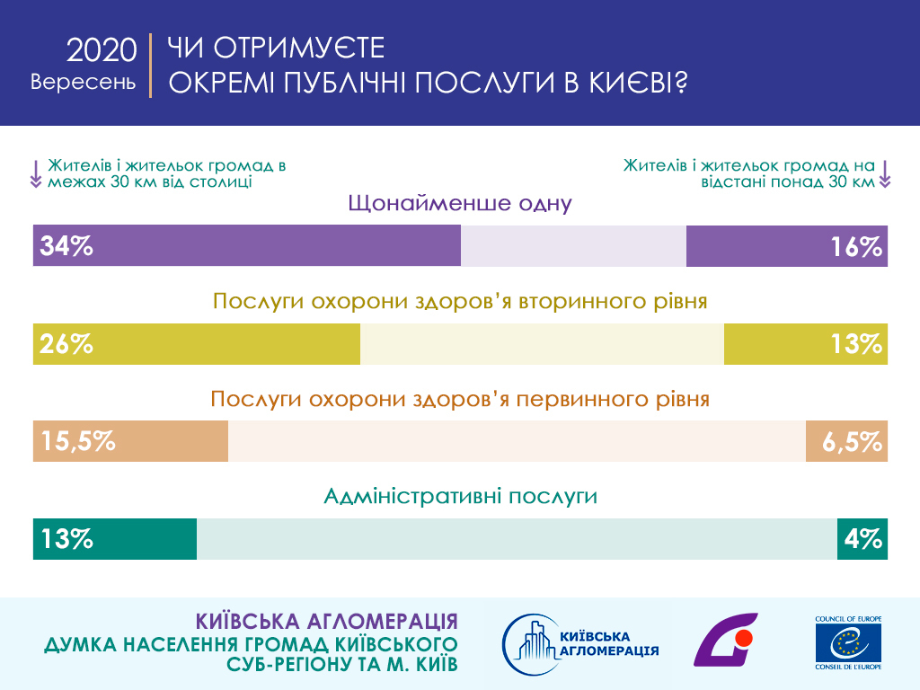 Найчастіше (з-поміж усіх публічних послуг) жителі субрегіону отримують у столиці (а не у своїх громадах) медичну допомогу вторинного рівня (таких 26% з поселень до 30 км і 13% з понад 30 км). Очевидно, проблема у низькій якості такої послуги за межами столиці, розв’язання якої допоки незрозуміле.