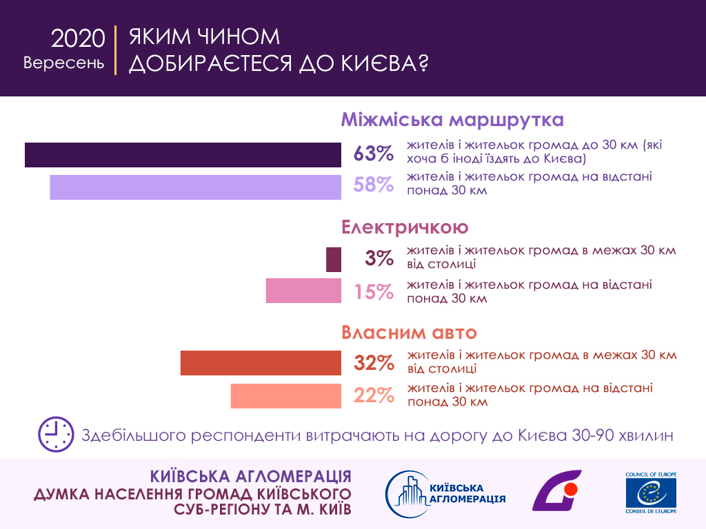Переважно вони добираються маршрутками – відповідно 63,1% ( до 30 км) і 57,8% (понад 30 км). А от електричкою, як це характерно для столиць Європи, – лише 14,5% (понад 30 км) та 3,4% ( до 30 км). На дорогу ( лише в один бік) найчастіше респонденти з передмістя витрачають0,5 – 1 годину(49% до 30 км), з віддалених населених пунктів (понад 30 км) – 1-1.5 год (43% респондентів). Найчастіше це незручний, травматичний спосіб пересування, що призводить до транспортного хаосу, і водночас ненадійний та неефективний для оподаткування.
